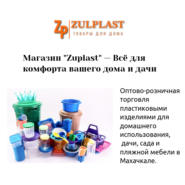 Магазин "Zulplast"- это надежный поставщик и продавец пластиковых изделий, ориентированный на оптовую и розничную торговлю в Дагестане. Мы предлагаем широкий ассортимент продукции, предназначенной для домашнего пользования, включая все необходимые товары для бытовых нужд (кроме бытовой техники). В нашем ассортименте вы найдете разнообразные пластиковые изделия для кухни, ванной, хранения и организации пространства. Кроме того, у нас есть продукция для дачи, сада и пляжной мебели, которая идеально подойдет для отдыха и комфортного времяпрепровождения на природе. Мы стремимся обеспечить наших клиентов качественными товарами, доступными ценами и высоким уровнем сервиса, делая ваше повседневное жизнь удобнее и приятнее.