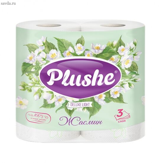 Туалетная Бумага Plushe Deluxe Light 'Жасмин", 4 рулона*15 метров, 3 слоя, белый, ароматизация, 12 в упаковке