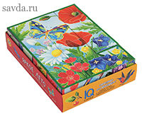 Набор состоит из 12 кубиков размером 4х4 см. Ребёнку нужно сложить картинку из 12 фрагментов. В качестве подсказки даны 6 картинок с изображением растений и животных. Картинка кладётся на дно коробочки, и ребёнок ставит на неё нужные кубики. Во время игры происходит знакомство с понятиями «часть» и «целое», развивается умение работать по образцу. Наклейки на кубики сделаны из качественной гладкой бумаги, которая не портится от игры.