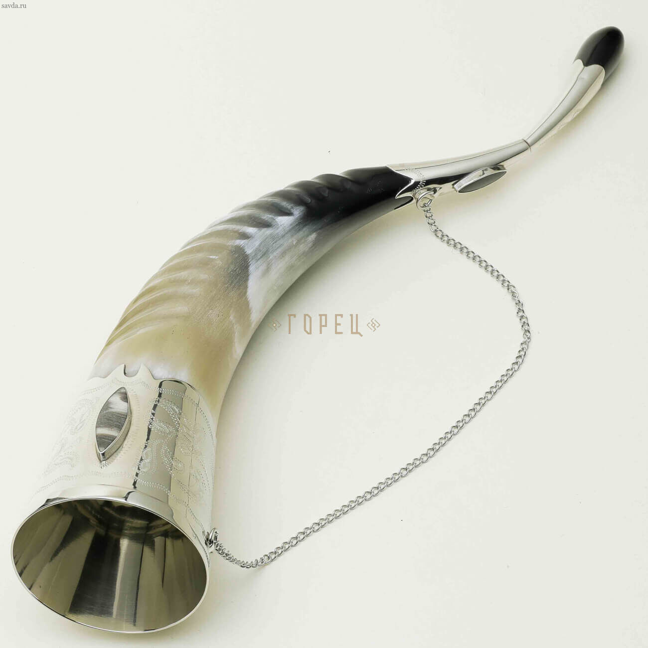 Сувенирный бычий рог с мельхиоровыми вставками + вставки из эбонита + чаша для питья. Дополнительно на роге сделано рифление под рог тура.