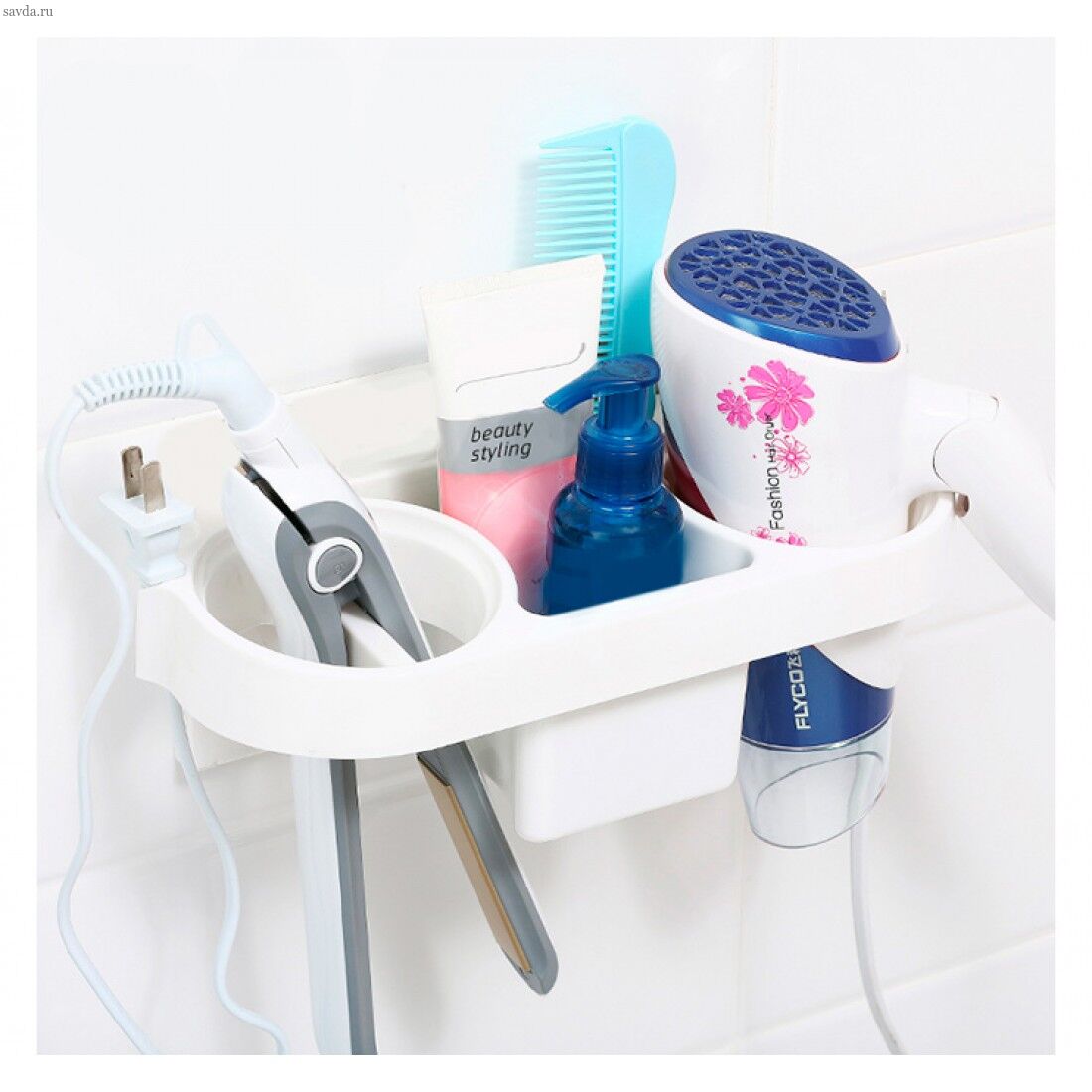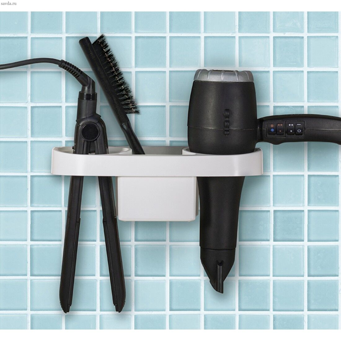 Полка для фена - удобный аксессуар для ванной комнатыИмеет:- отделение для фена, с ребрами для надежной фиксации;- двойное отделение для щипцов для завивки, утюжков, насадок;- лоток для хранения расчесок, средств для укладки, аксессуаров;- держатели для проводовПрочная, надежнаяКрепится на стену с помощью саморезов (не входят в комплект)Подходит для большинства типов бытовых приборов для волос