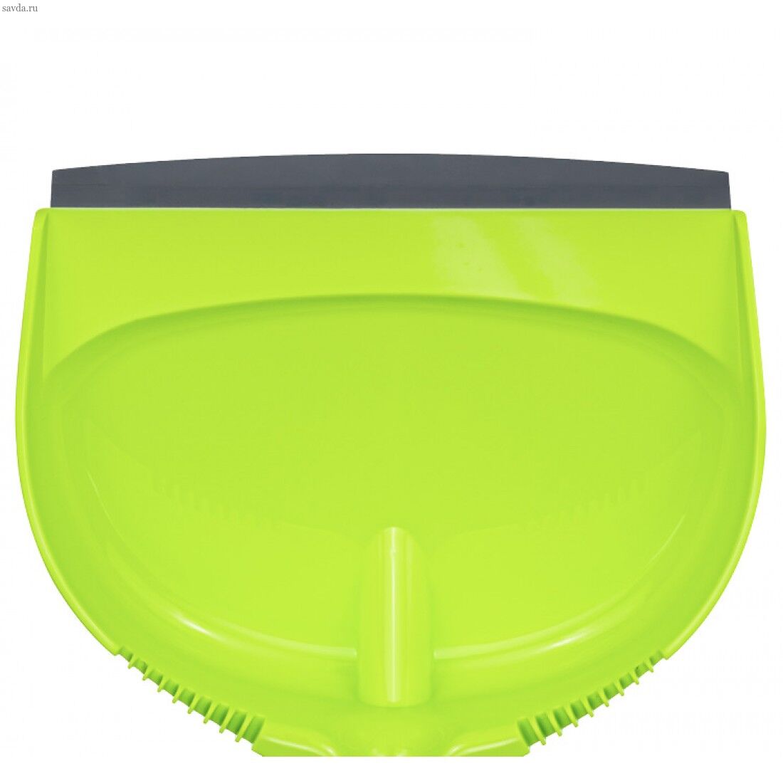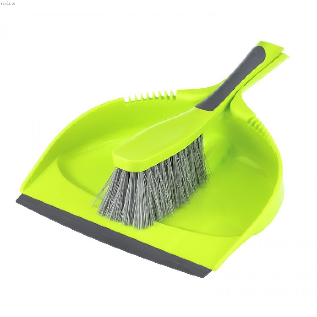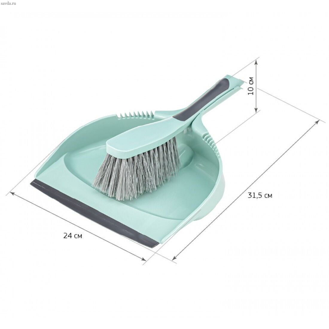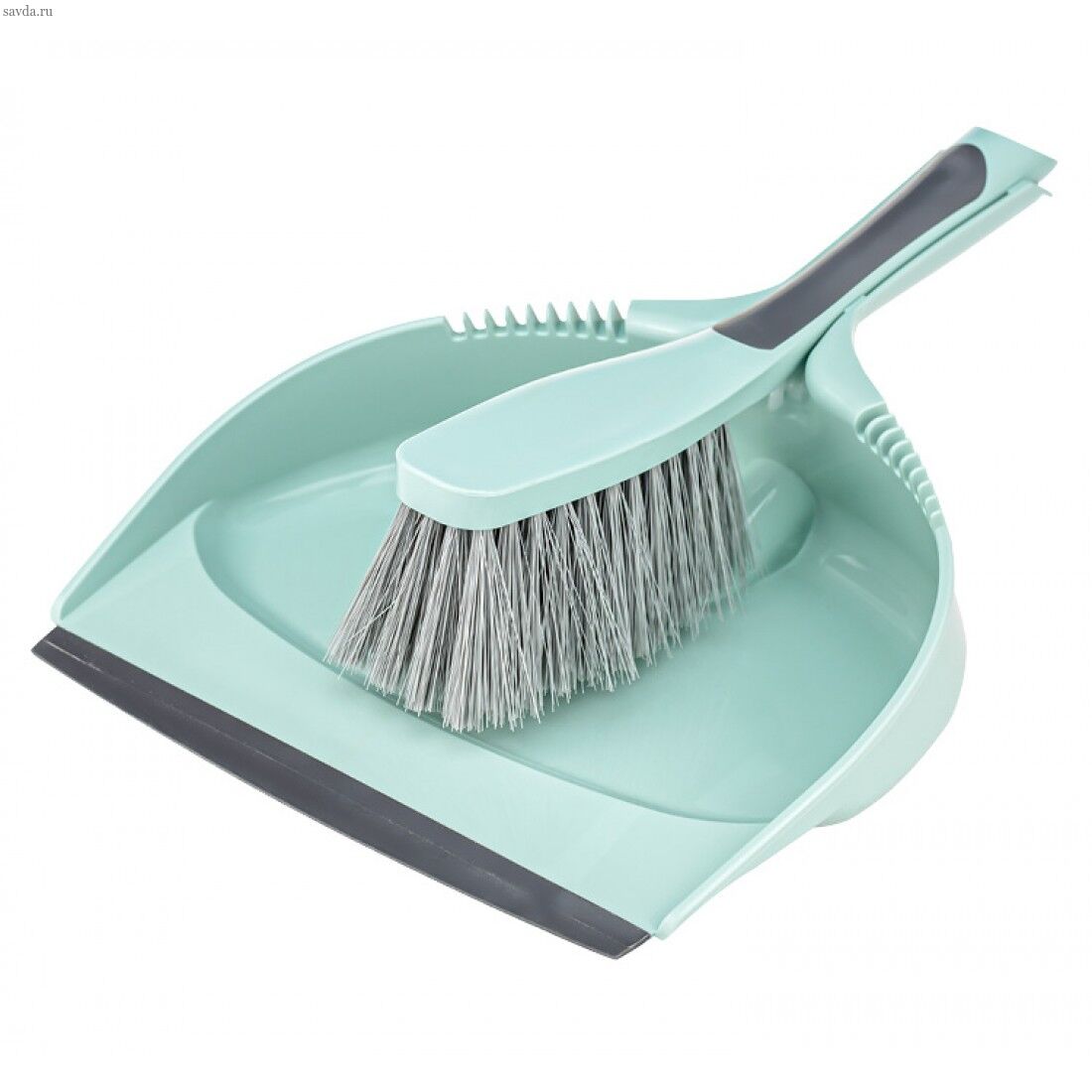 В комплекте есть совок оснащённый резинкой полукруглой формы, которая идеально прилегает к поверхности пола. Конструкция совка устроена так, что мусор легко собирается и не высыпается из ёмкости. Также на совке есть углубление для крепления набора на черенок щётки.