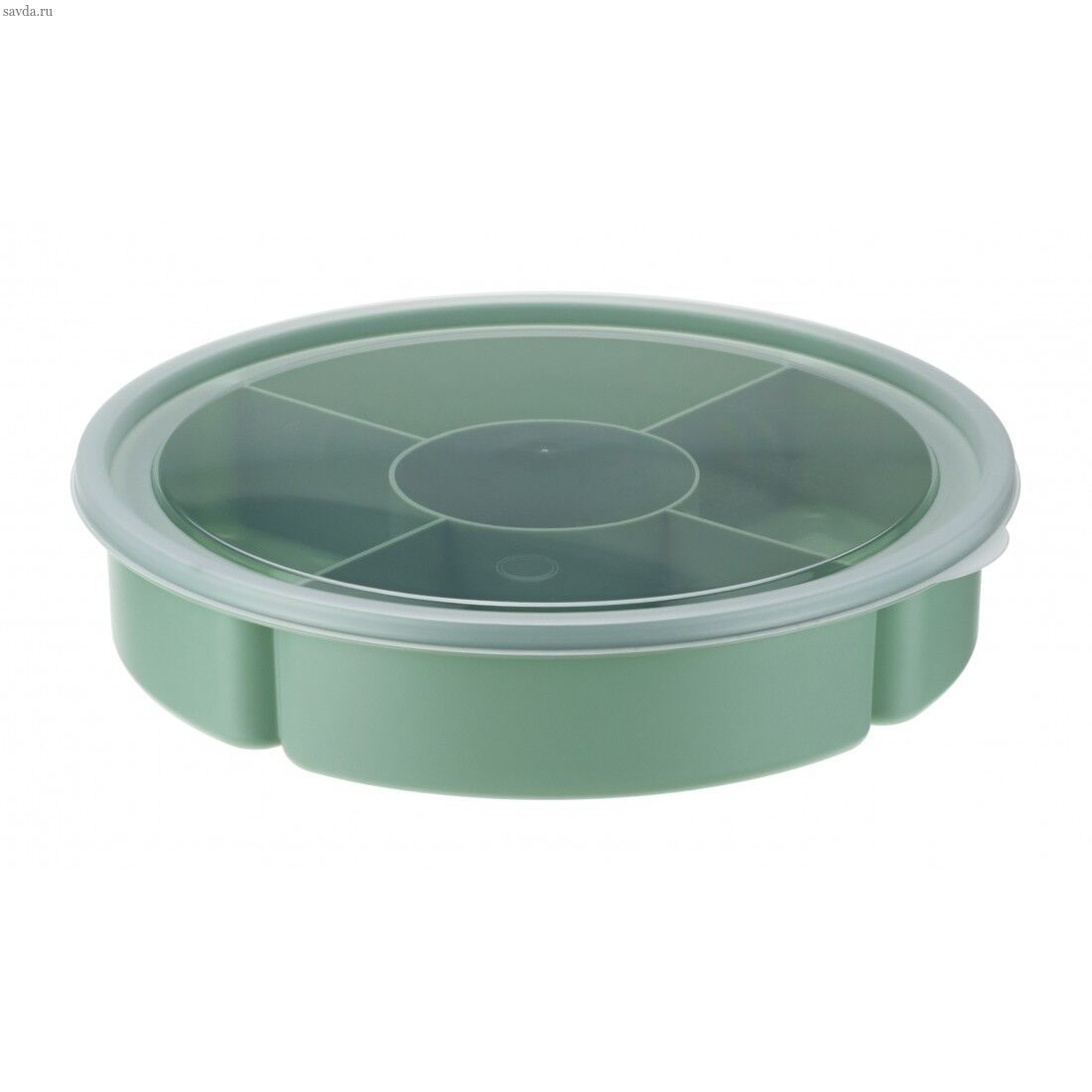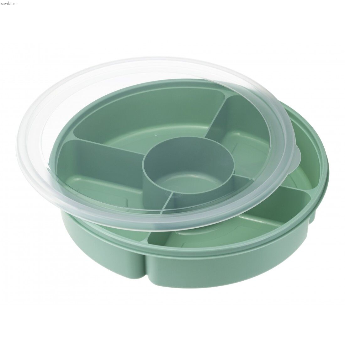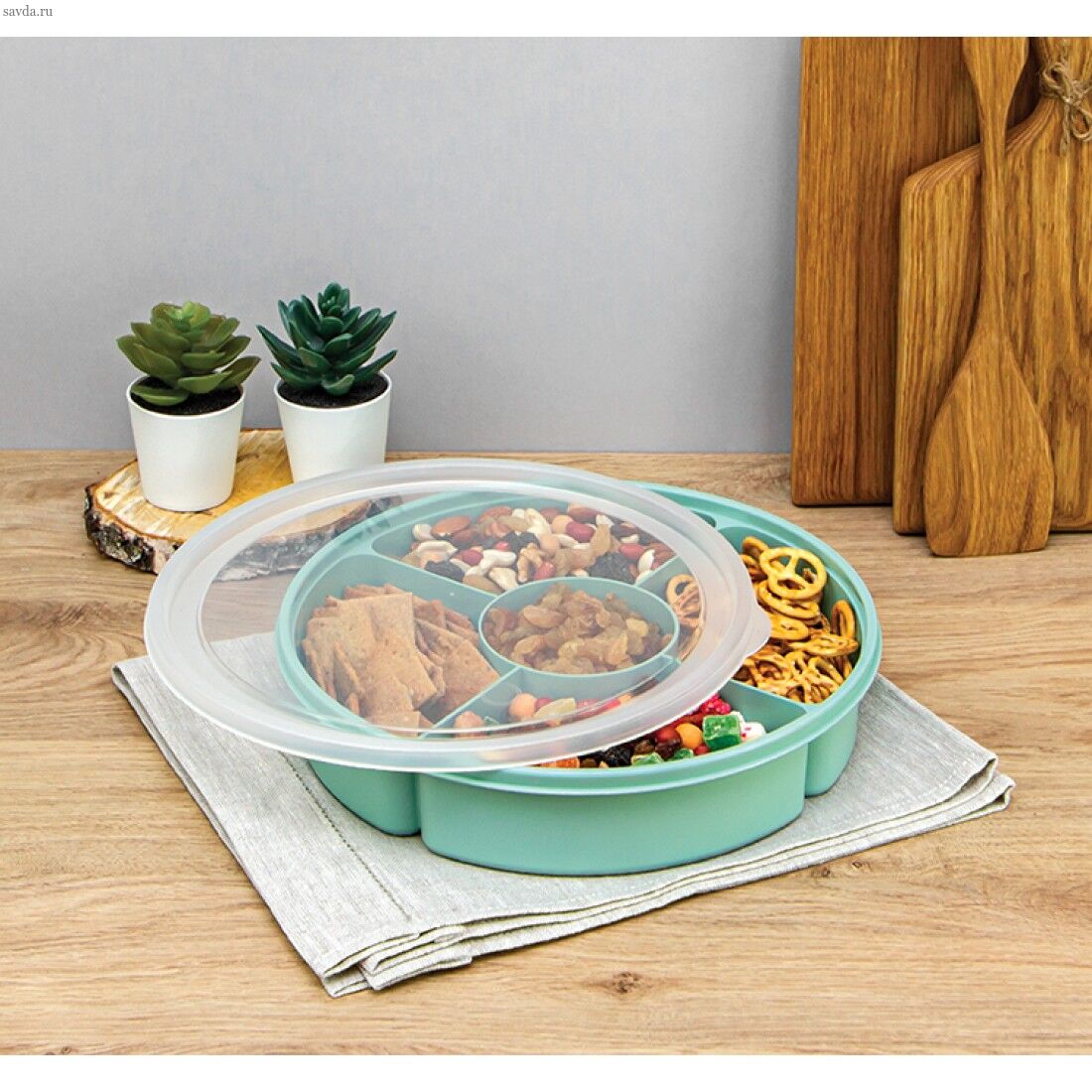 Менажница имеет крышку, которая надёжно сохранит содержимое ячеек в закрытом положении.