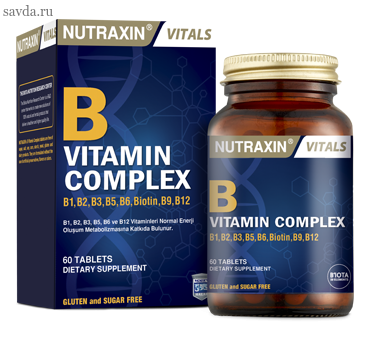 Комплекс нутраксин В - это смешанный продукт, состоящий из витаминов B1, B2, B3, B5, B6, B12 вместе с фолиевой кислотой, биотином, холином и инозитом.